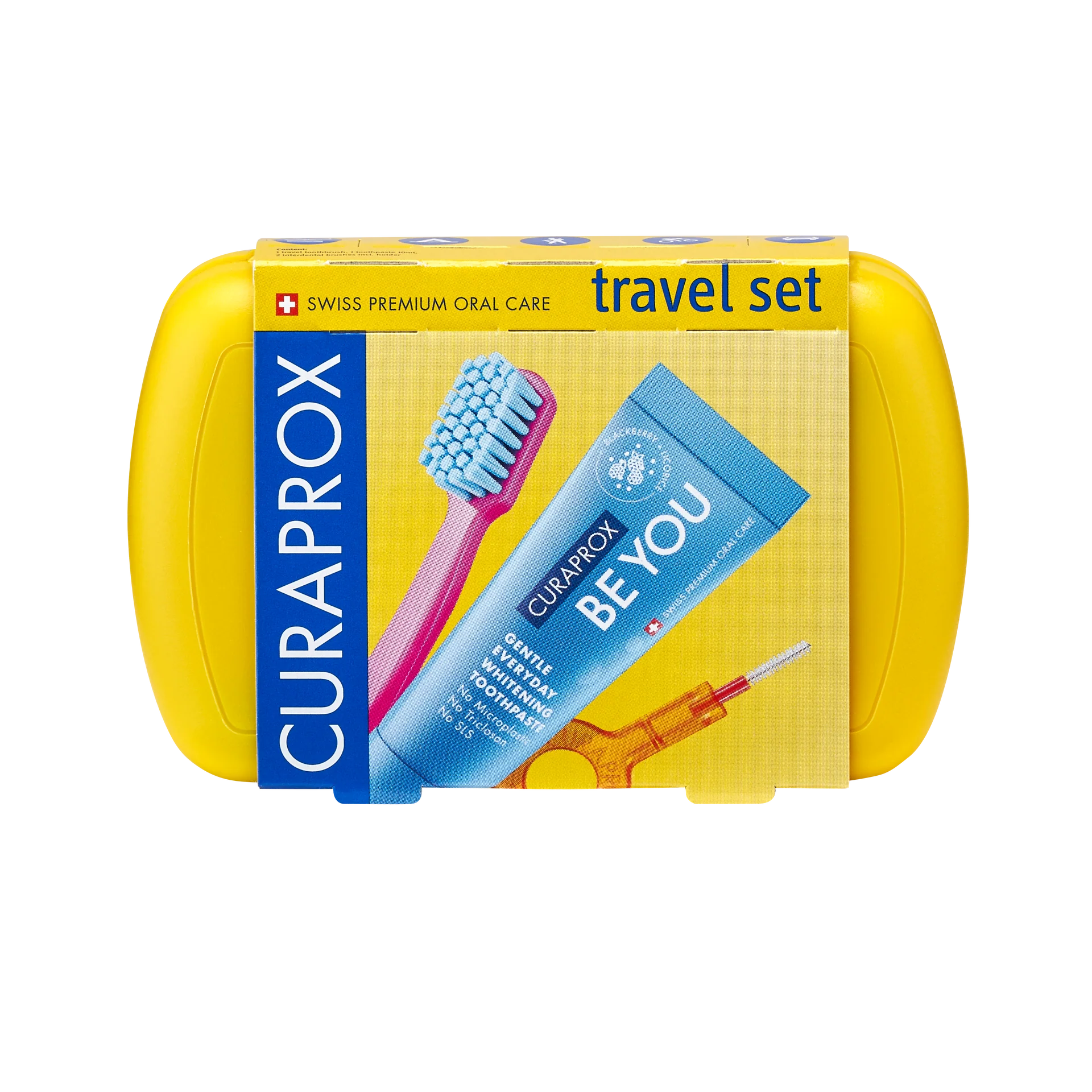 ערכת הנסיעות של Curaprox בצבע צהוב כוללת מברשת שיניים CS 5460 Ultra Soft עם 5,460 סיבי Curen® רכים במיוחד ומשחת שיניים Be You.