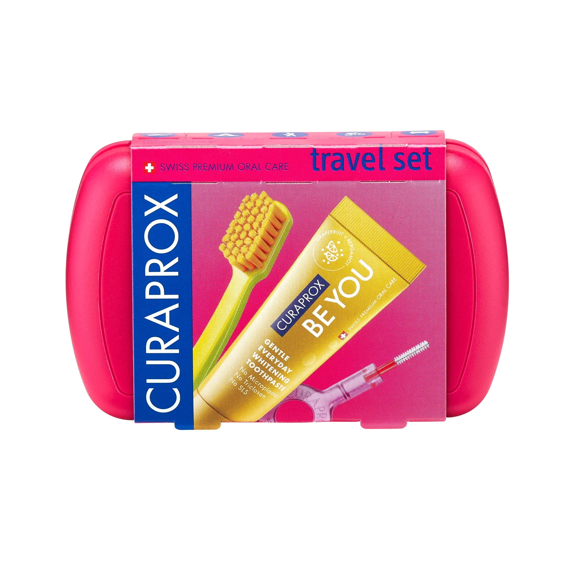 ערכת הנסיעות של Curaprox בצבע אדום כוללת מברשת שיניים CS 5460 Ultra Soft עם 5,460 סיבי Curen® רכים במיוחד ומשחת שיניים Be You.