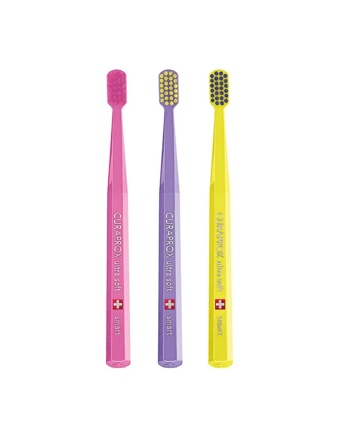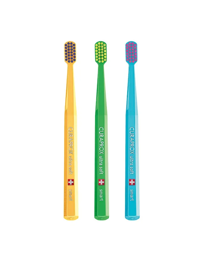 מארז של שלוש מברשות Curaprox Smart Ultra Soft – המברשת בעלת הראש הקומפקטי במיוחד, המתאימה לילדים מגיל 5 וגם למבוגרים המחפשים צחצוח עדין אך יעיל.